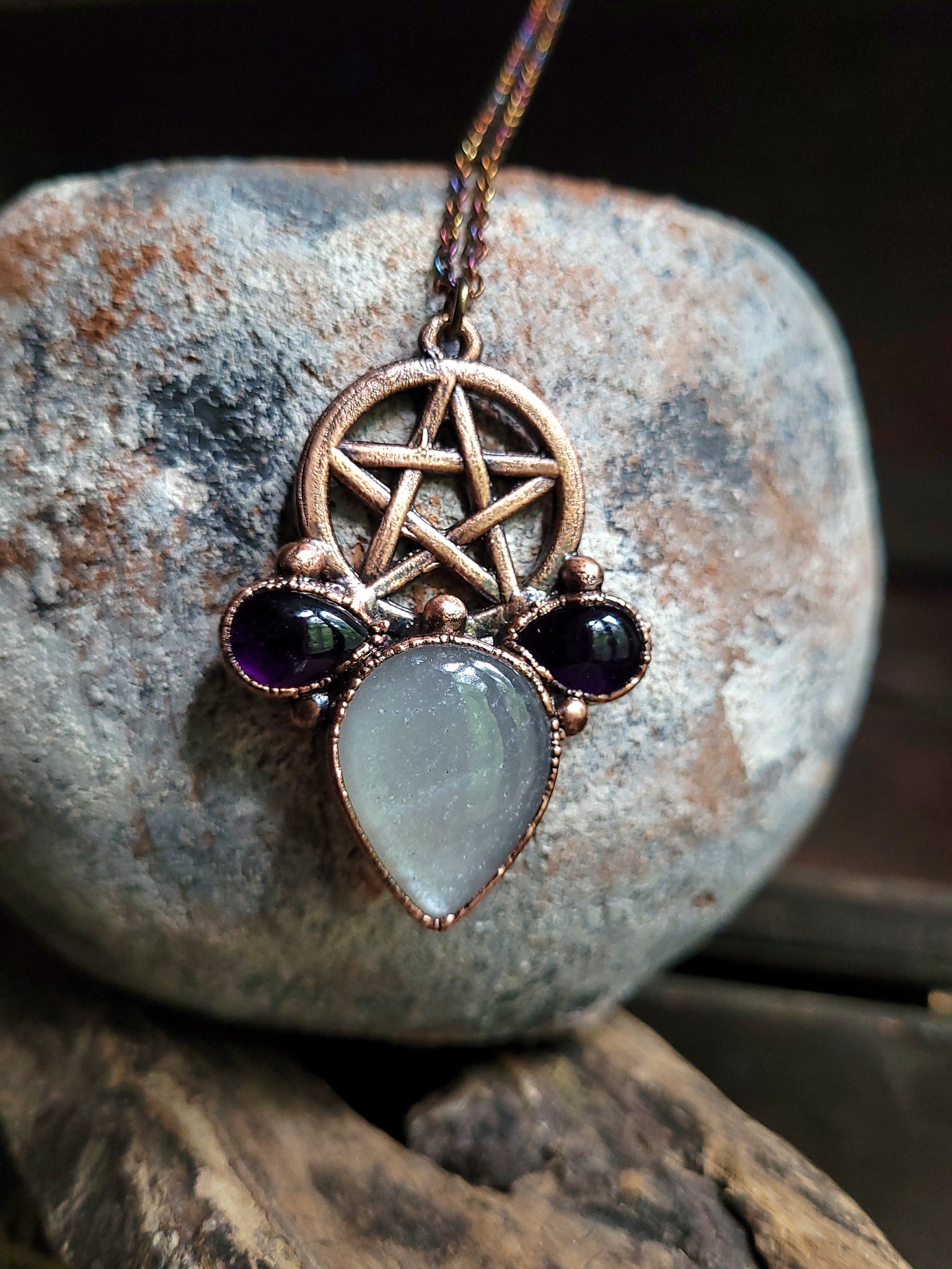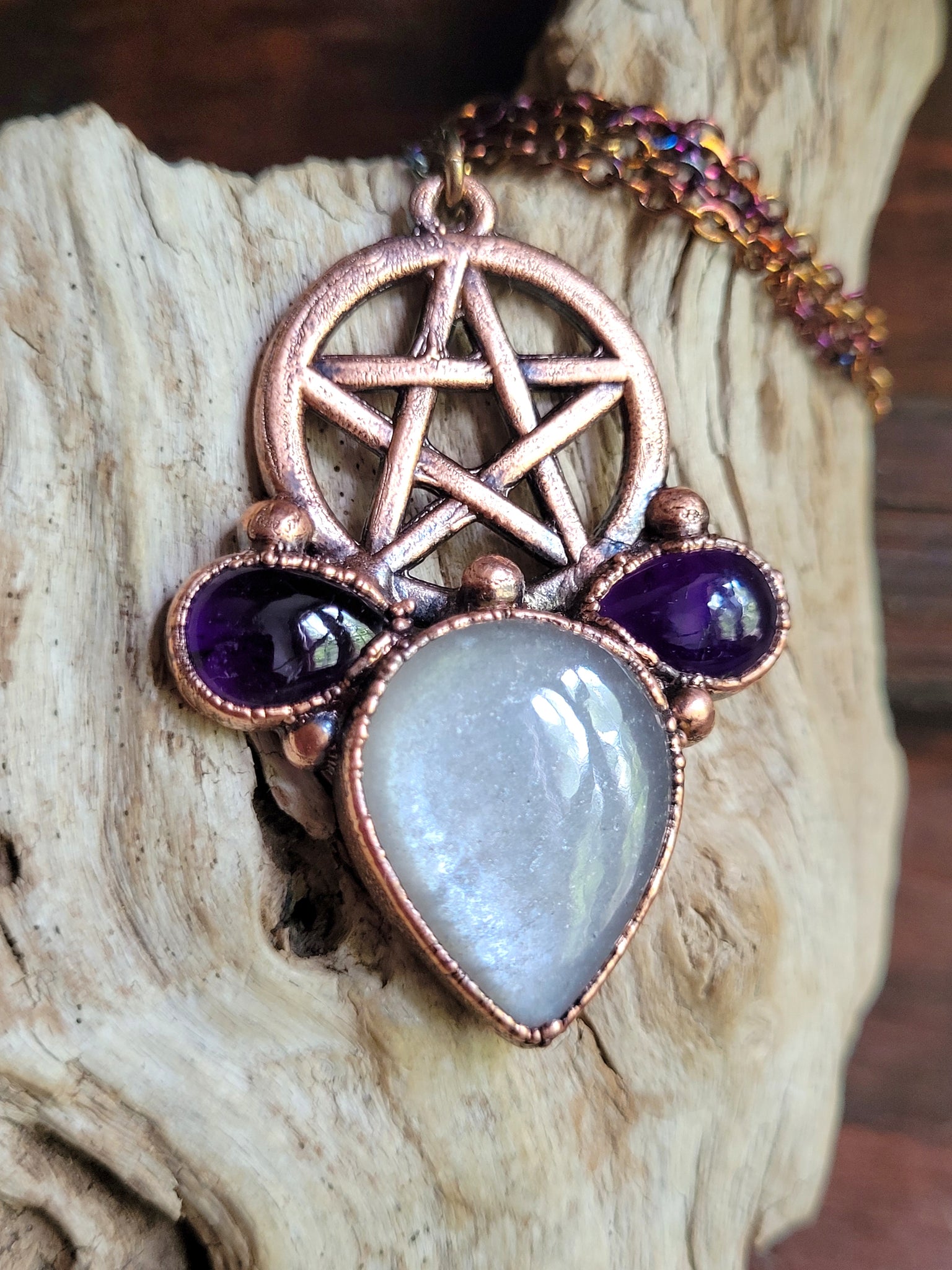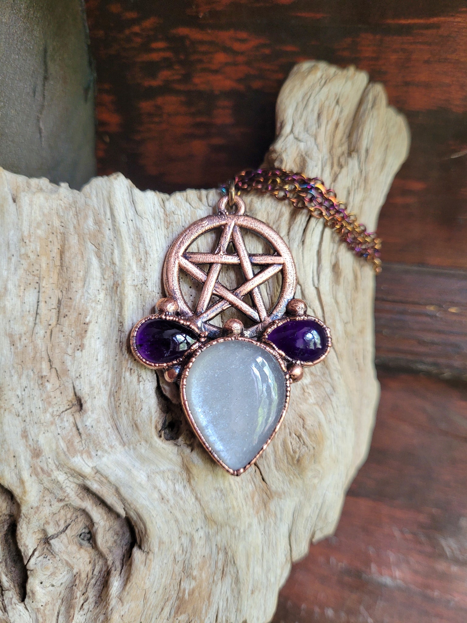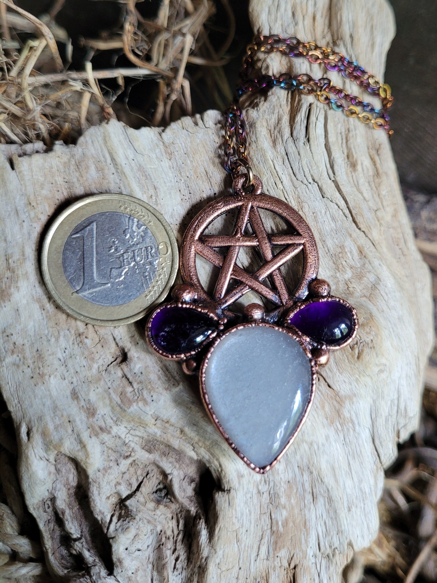 Il gioiello è realizzato in Rame trattato con patina anticante per un aspetto magico e fuori dal tempo, viene fornito con una catenina in acciaio policromo di 45 centimetri e confezionato in una robusta scatola per gioielli in cartone naturale