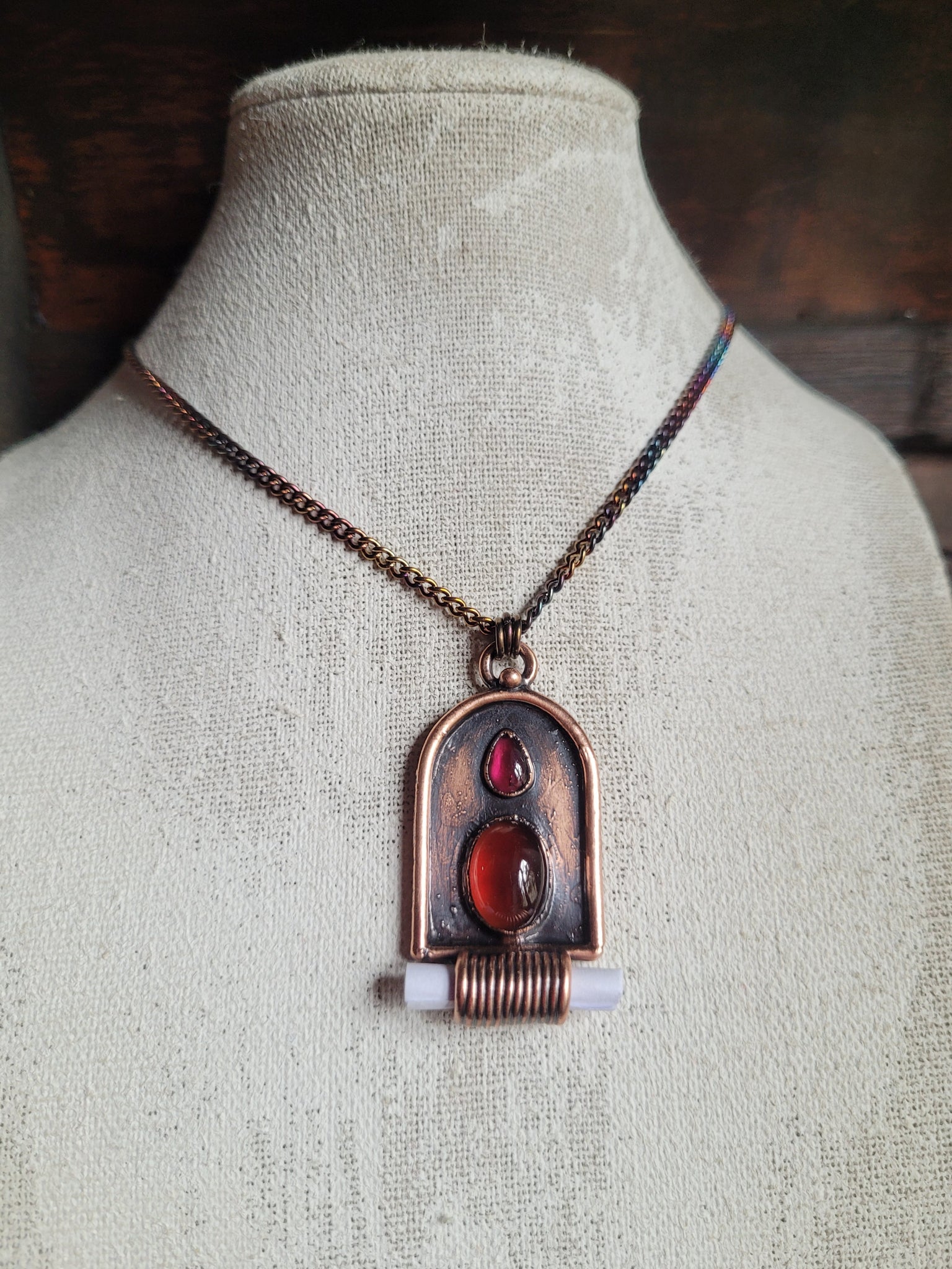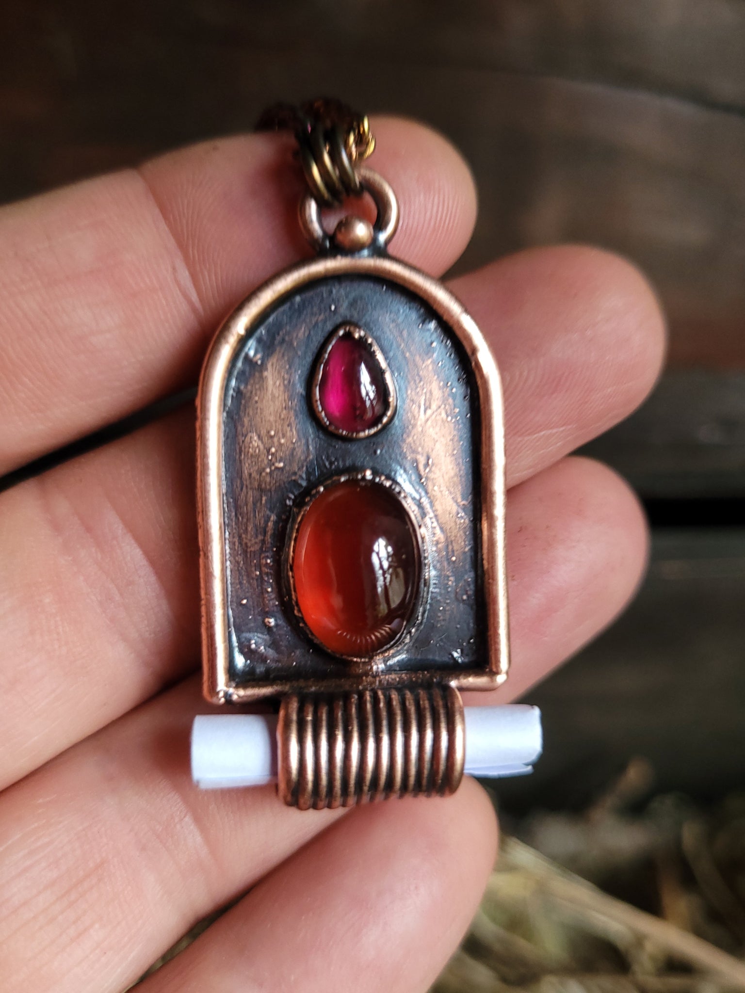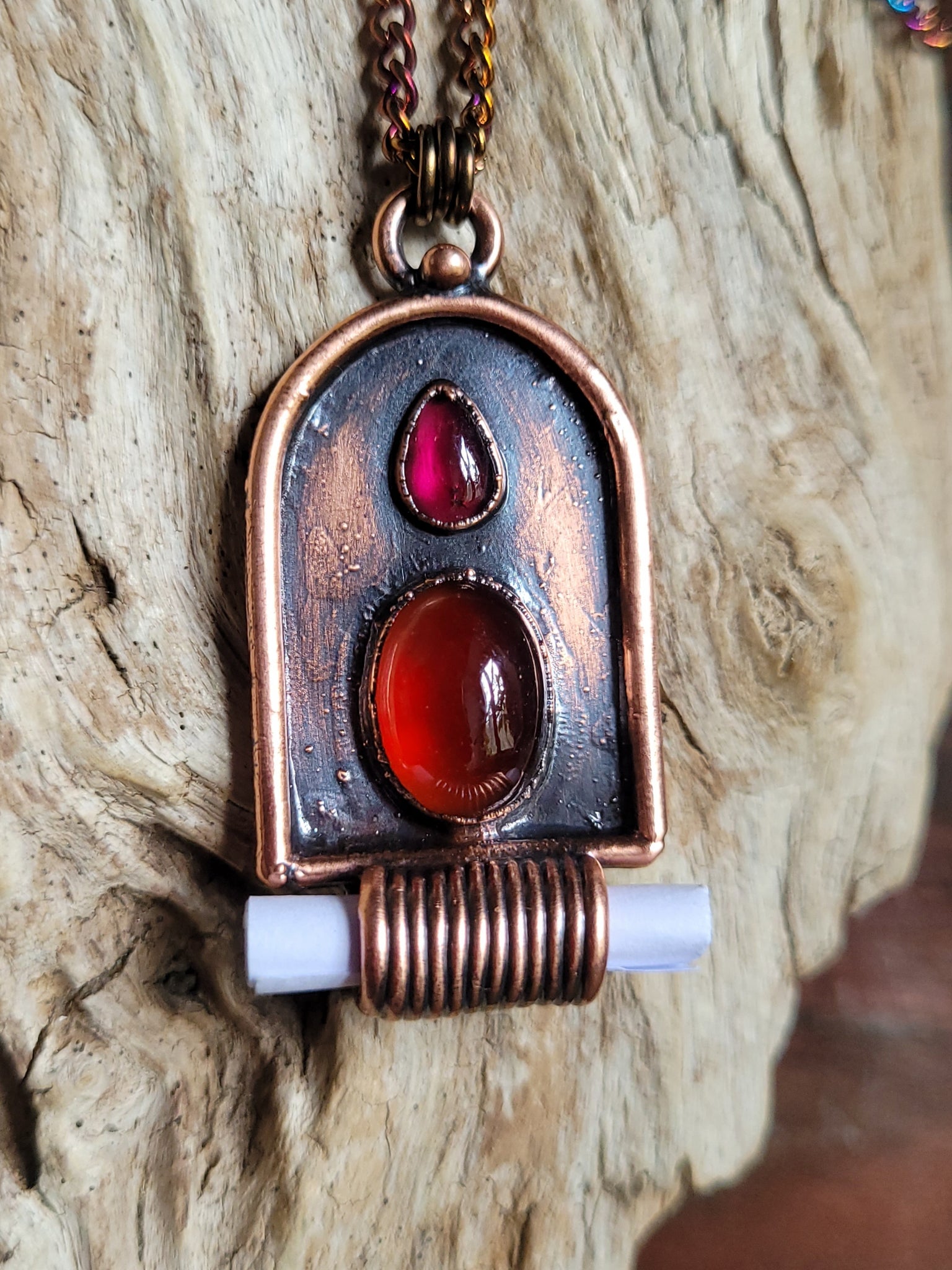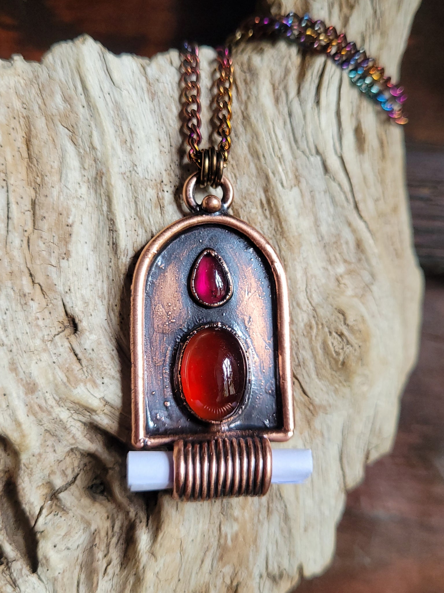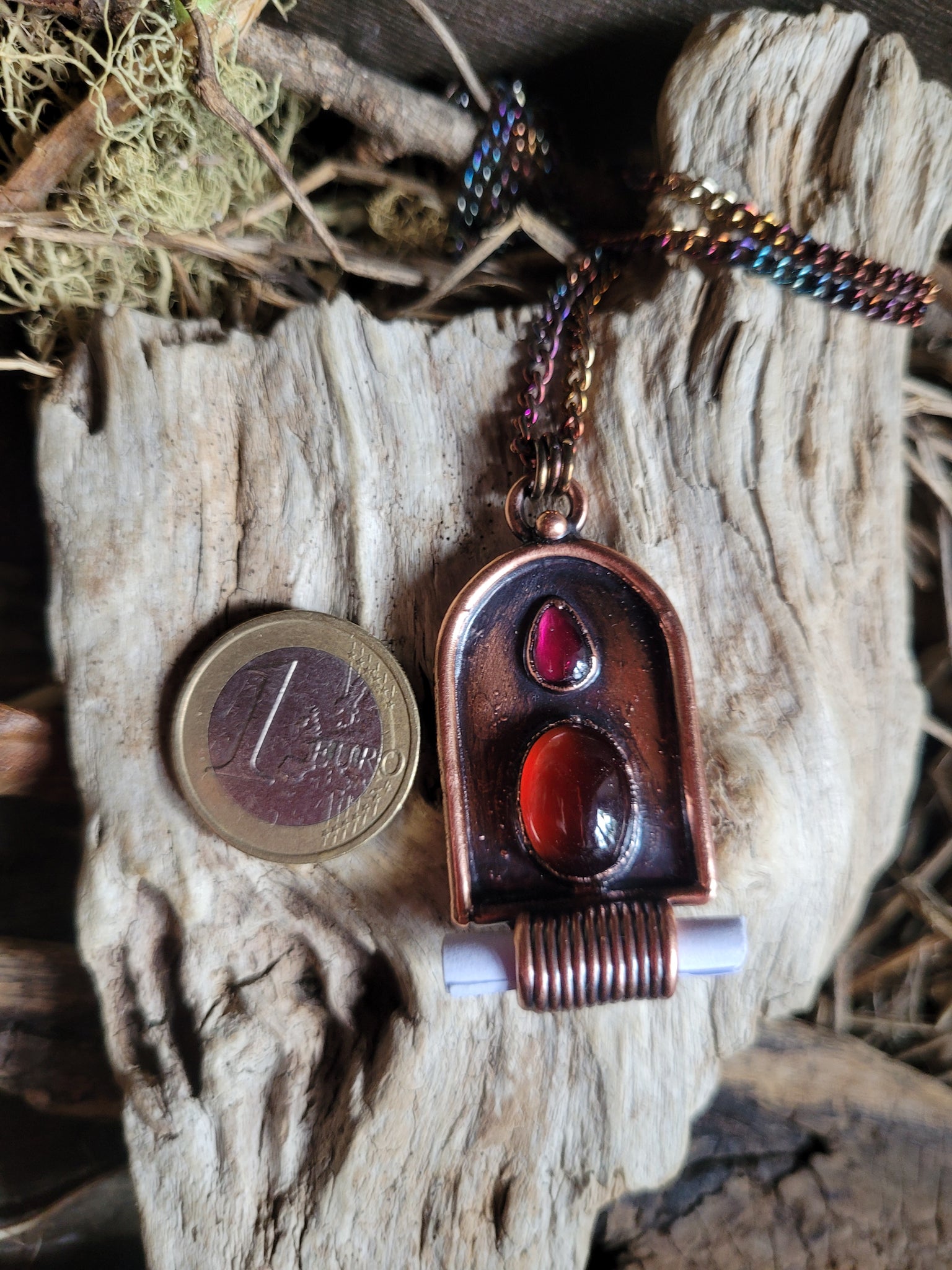 Il gioiello è realizzato in puro Rame trattato con patina anticante per un aspetto magico e fuori dal tempo, viene fornito con una catenina in acciaio policromo di 45 centimetri, confezionato in una robusta scatola per gioielli in cartone naturale.