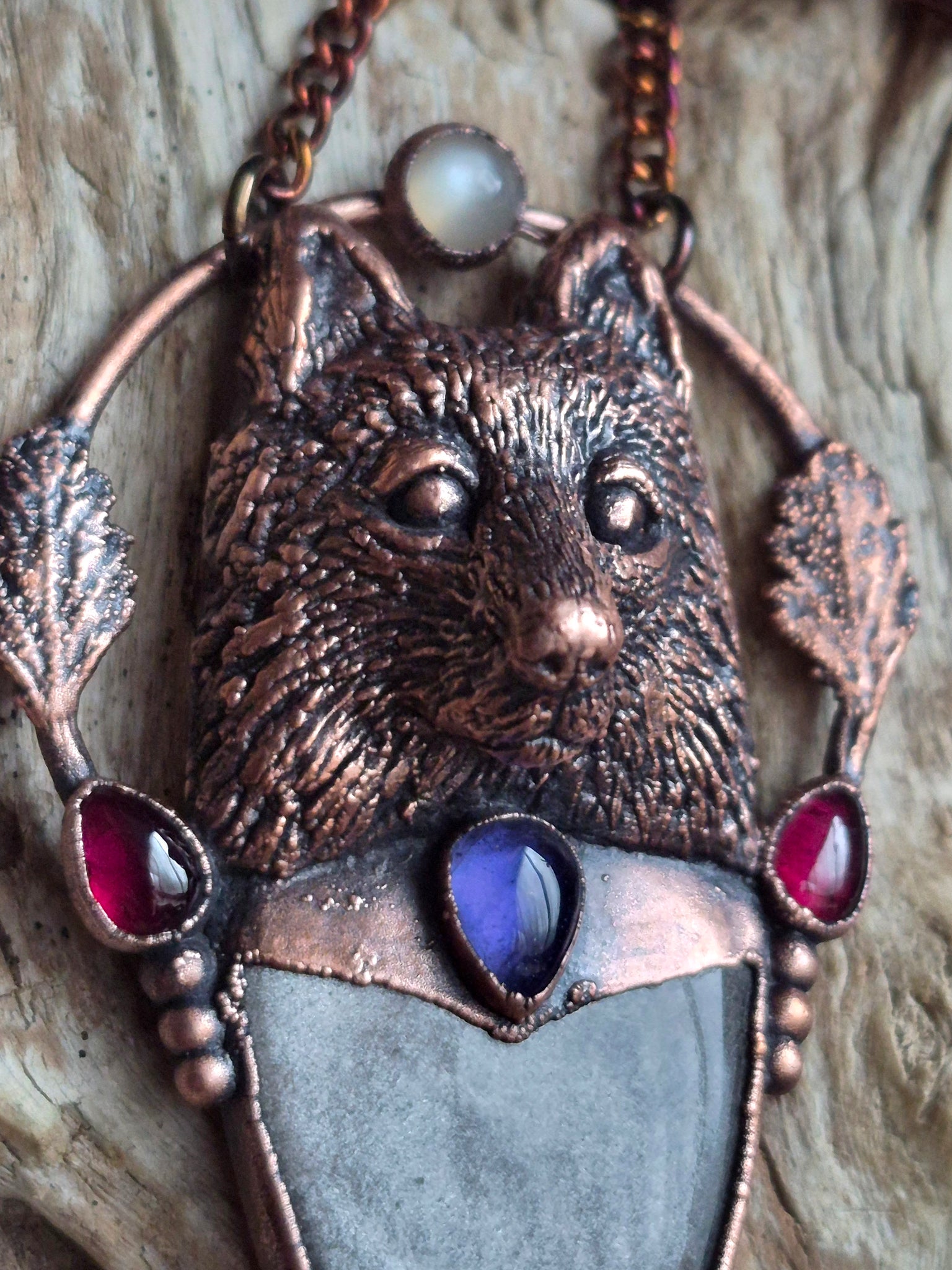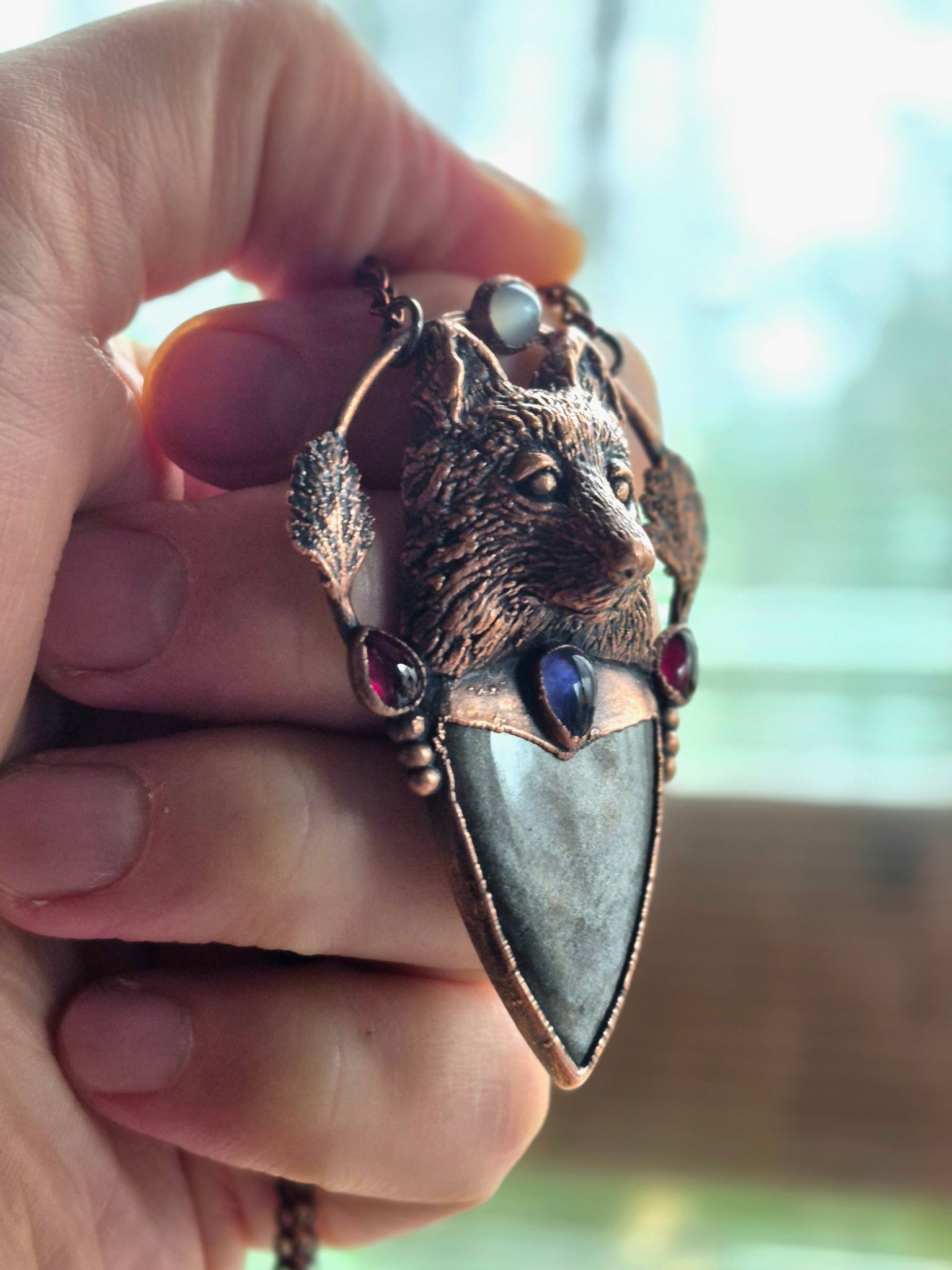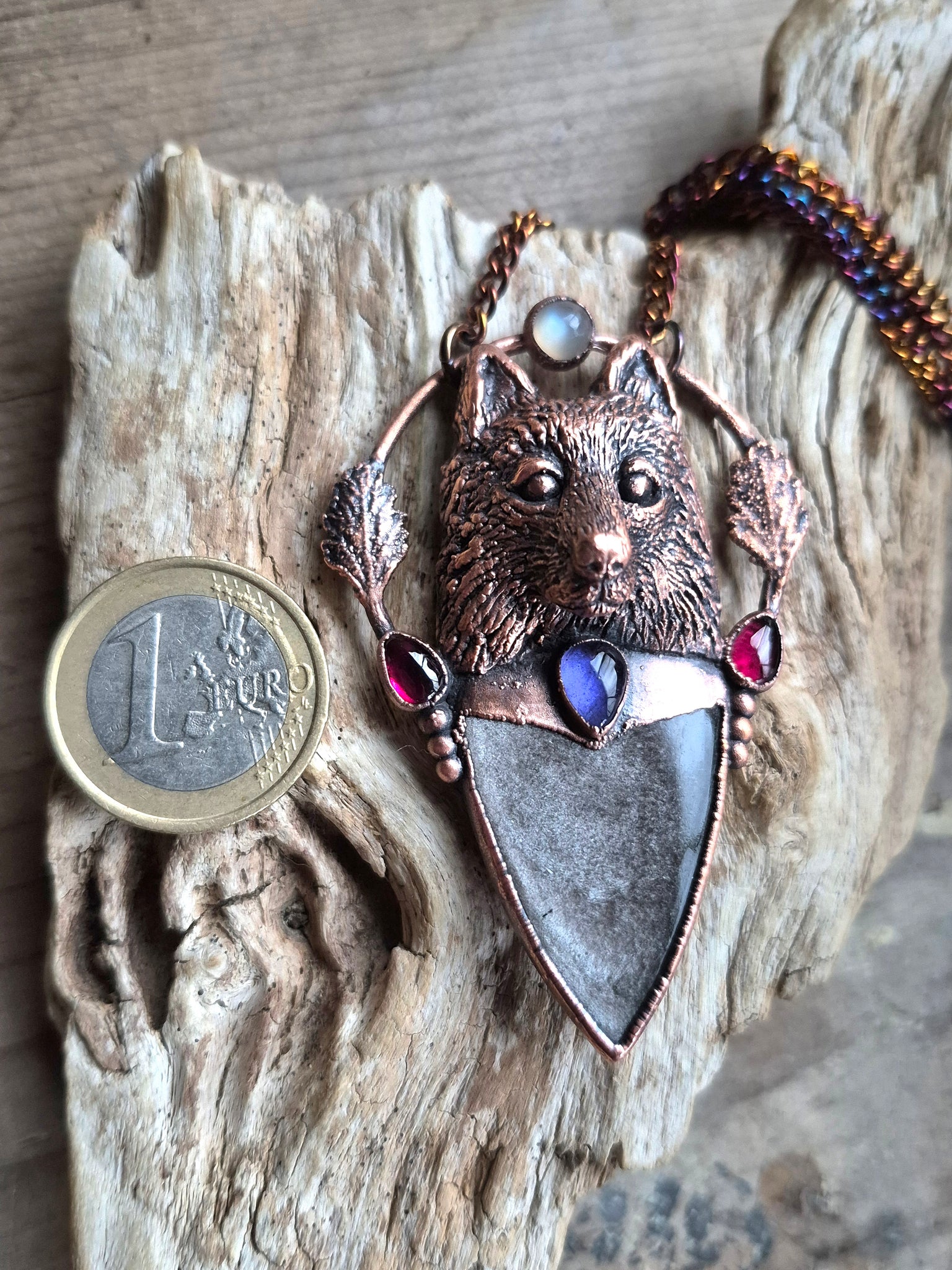 Materiali: Rame lavorato a mano con tecniche artigianali trattato con patina anticante, catenina in acciaio policromo di 45 centimetri.