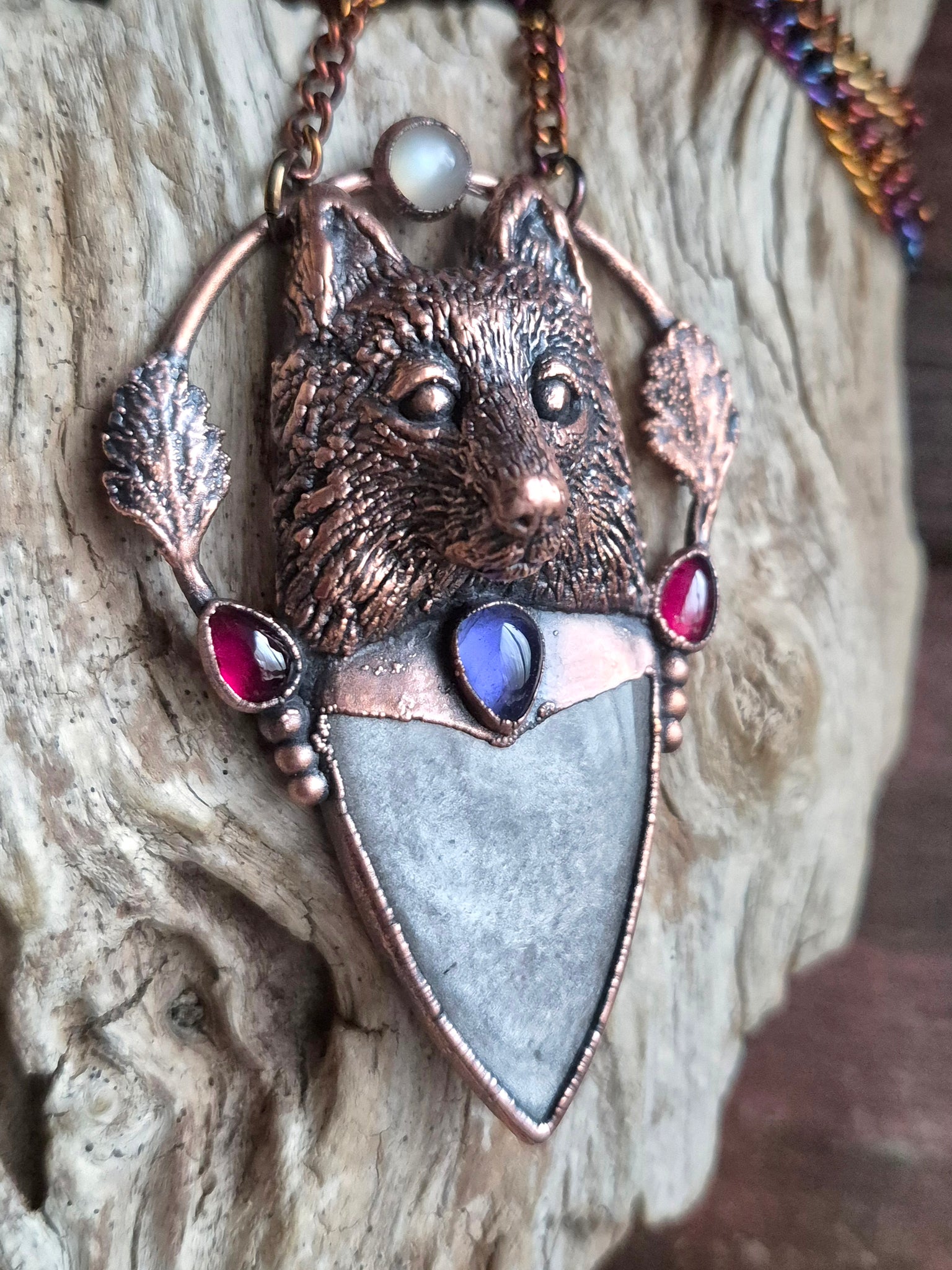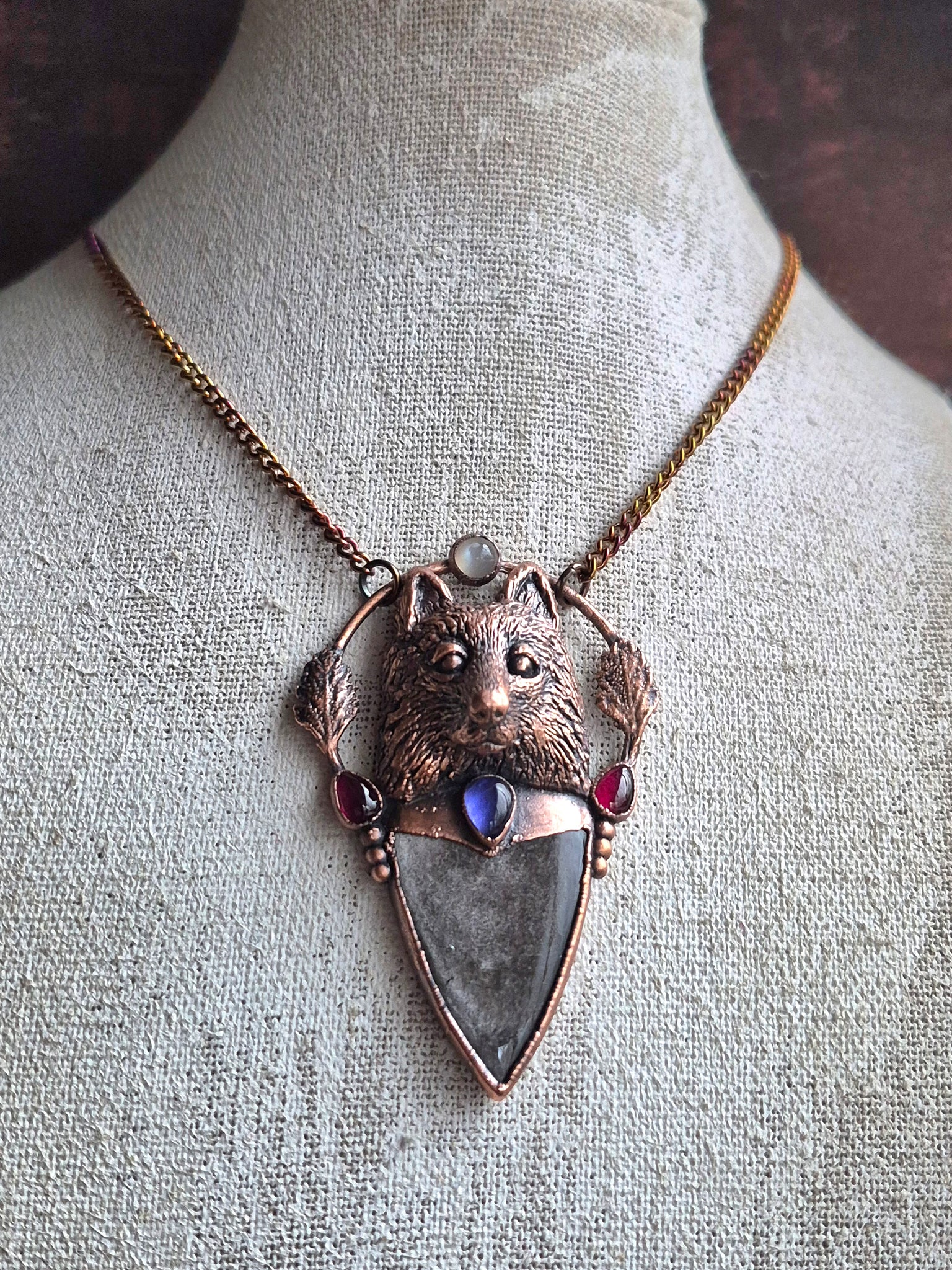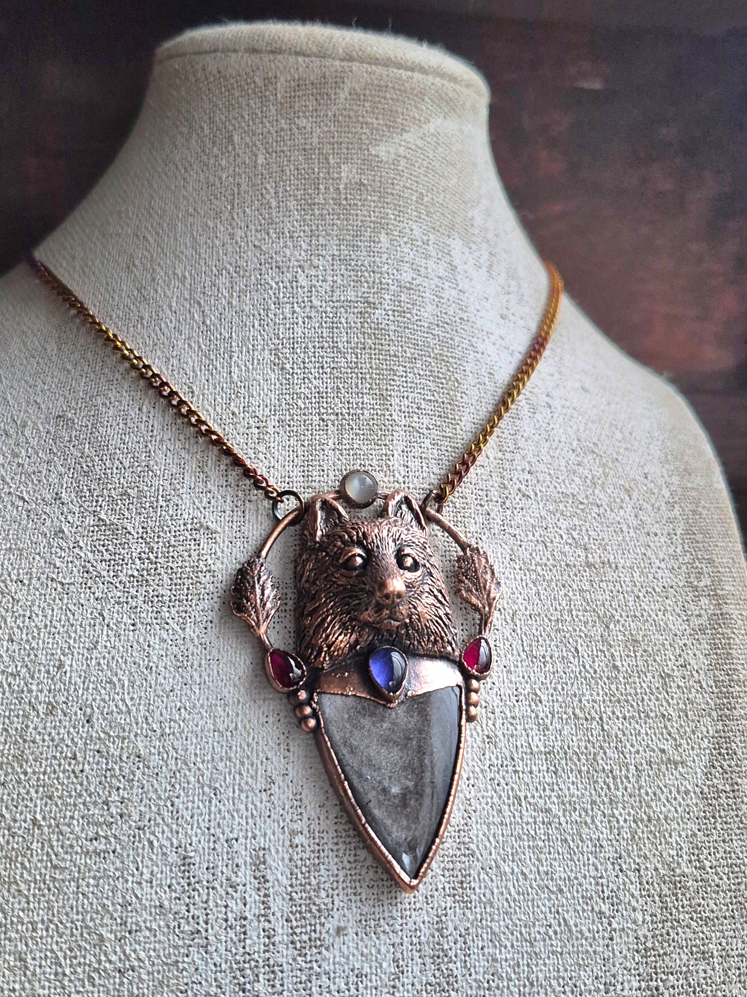 Materiali: Rame lavorato a mano con tecniche artigianali trattato con patina anticante, catenina in acciaio policromo di 45 centimetri.