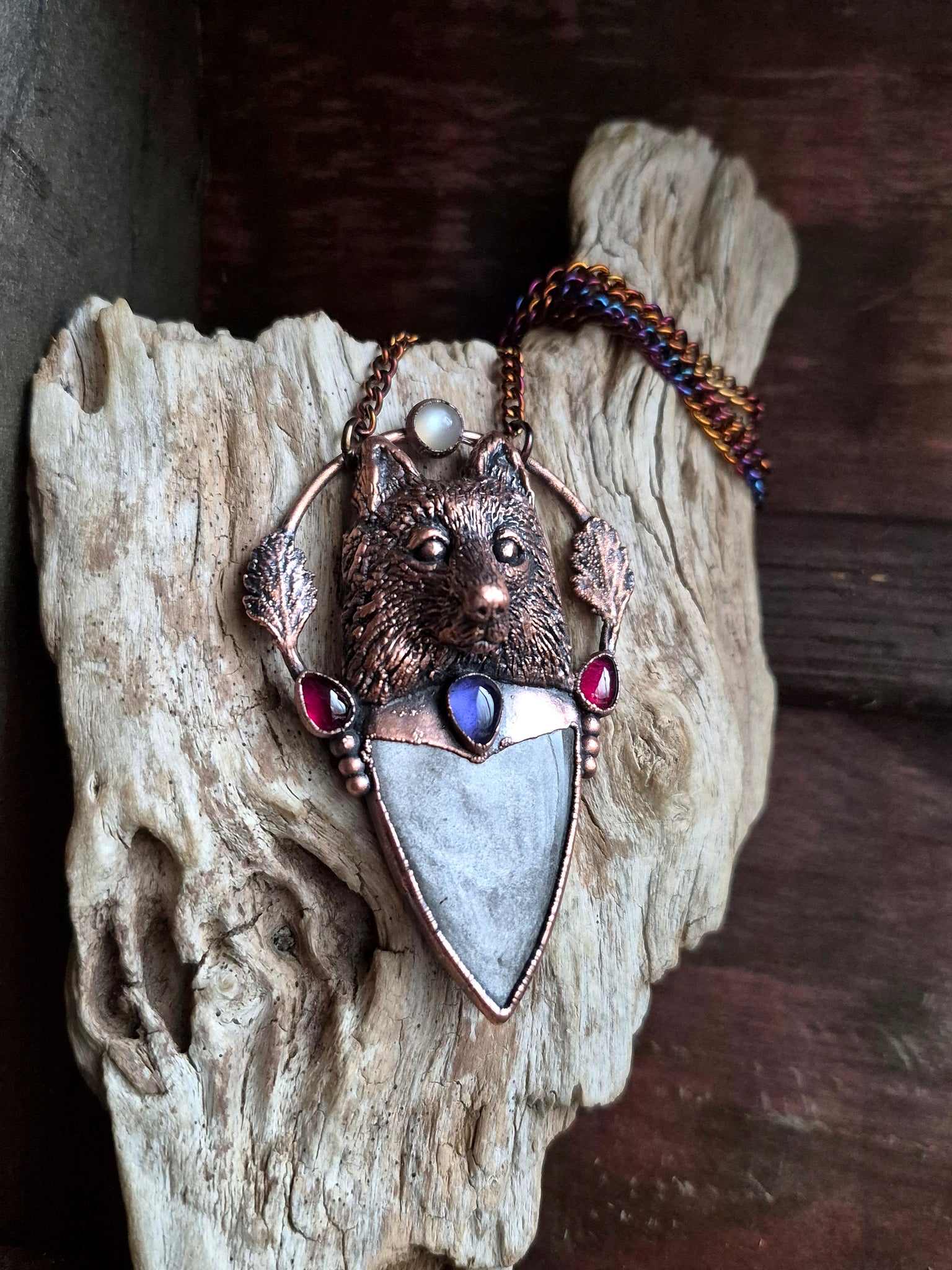 Al di sotto della scultura, il Lupo si trasforma in pura energia attraverso una combinazione sacra di gemme: