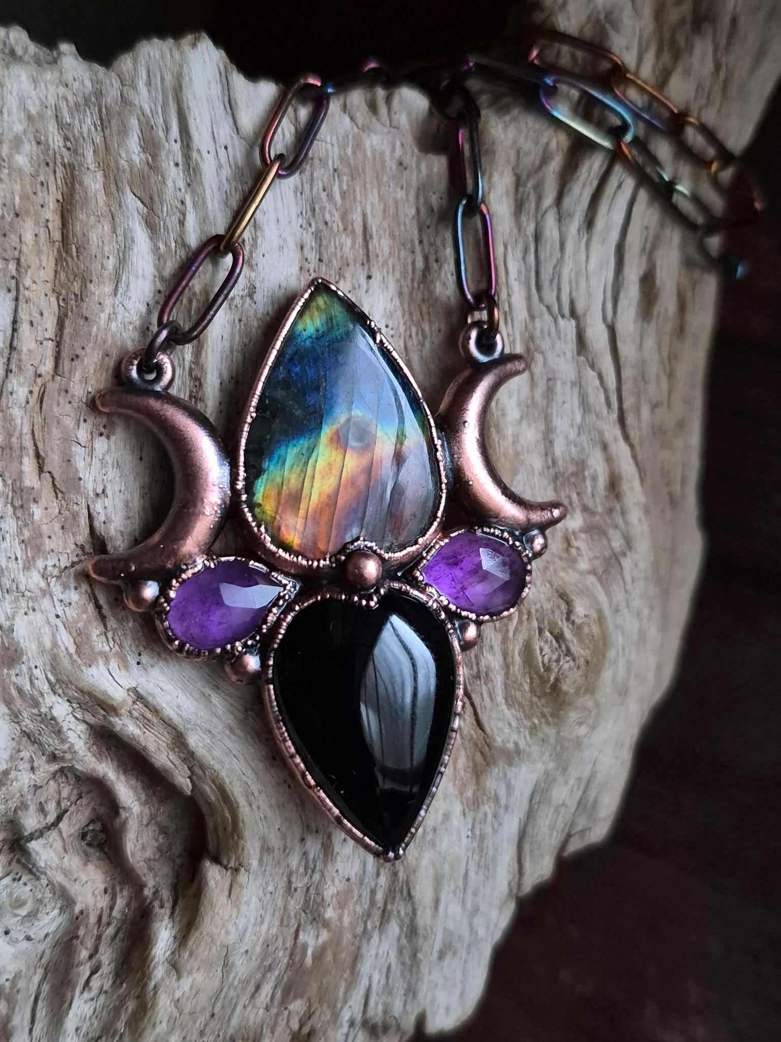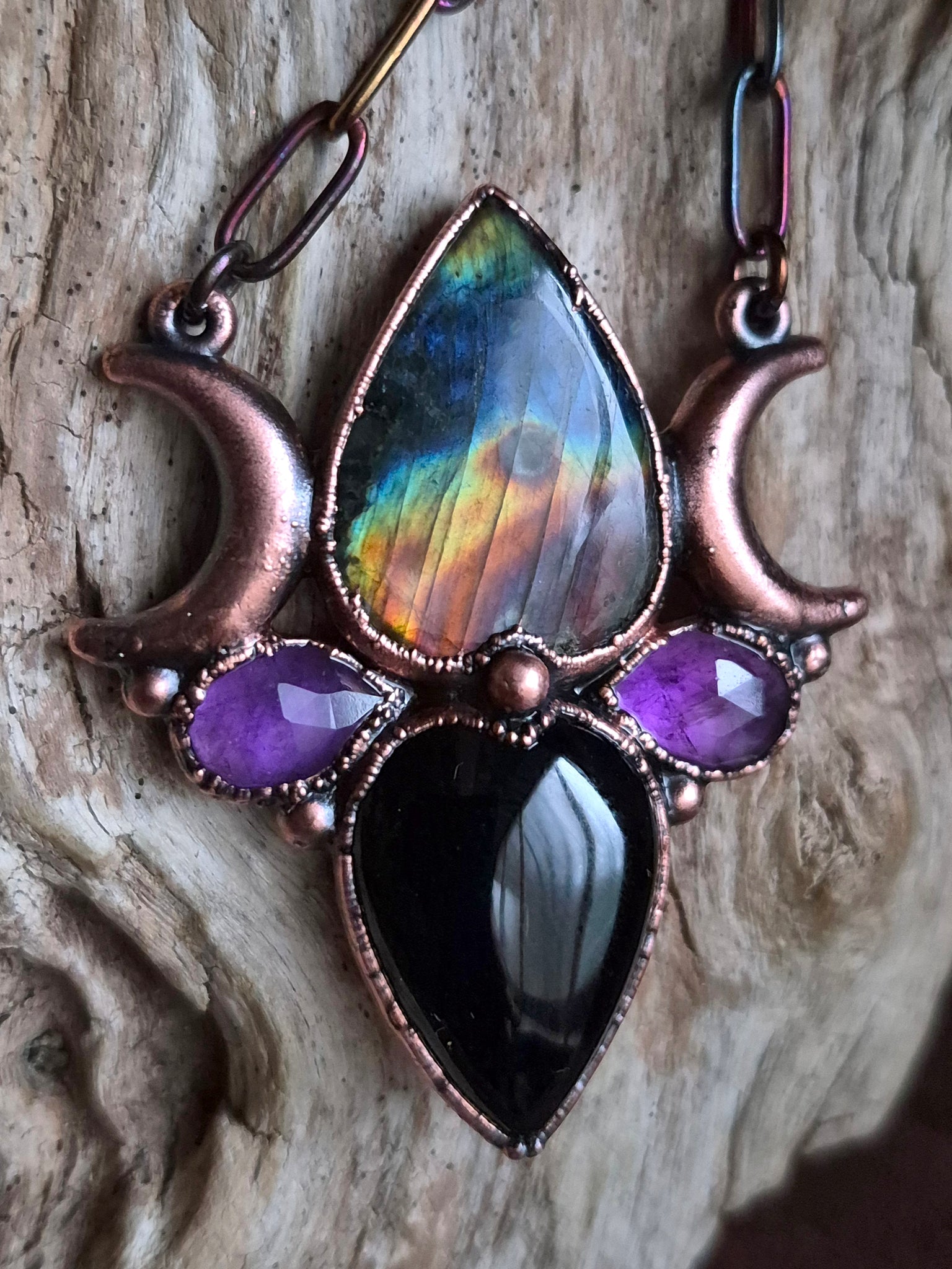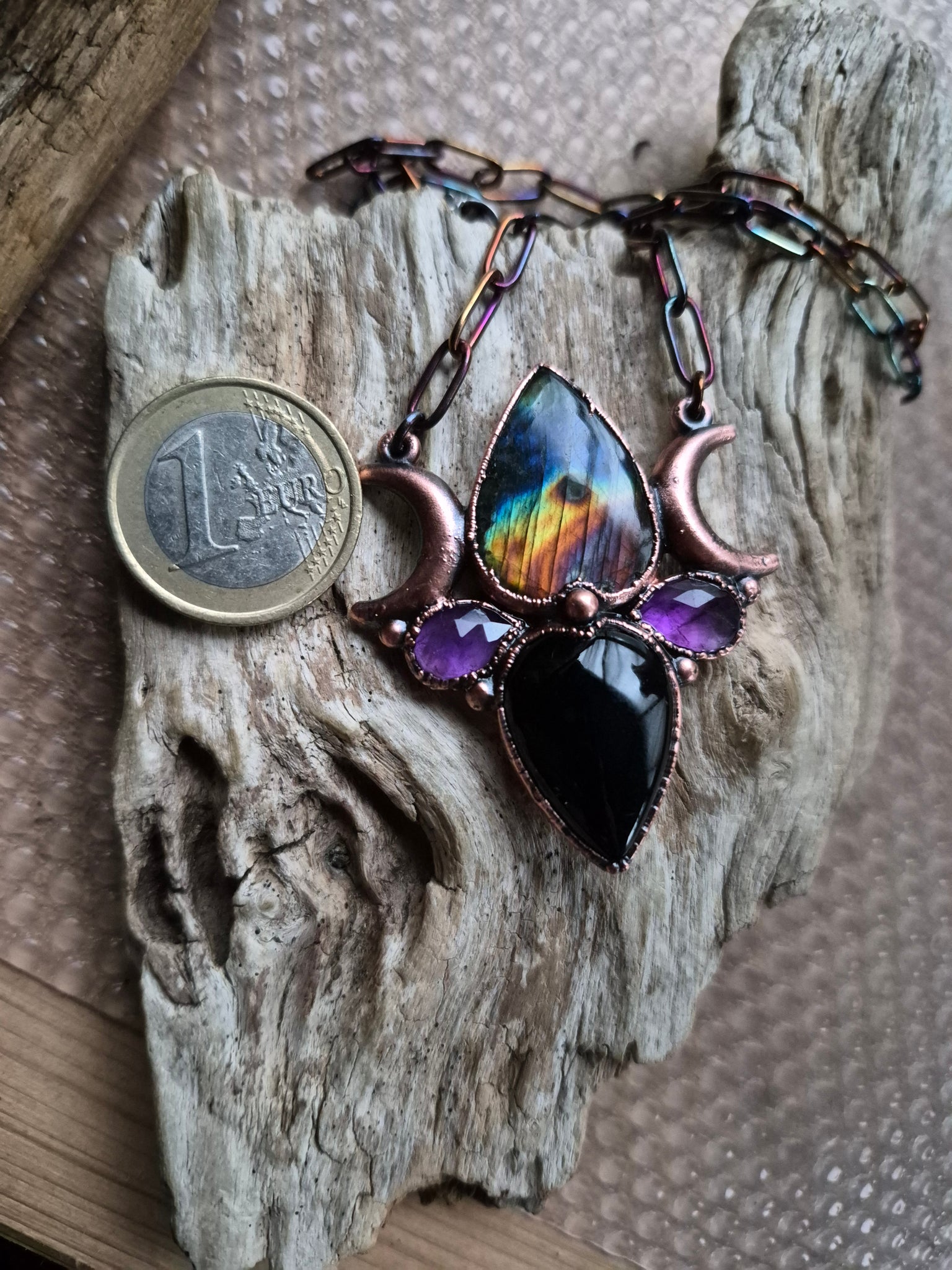 Materiali: Labradorite "Rainbow" di alta qualità, Rame naturale, Onice Nera, Ametista sfaccettata, catenina in acciaio Brunito di 40 centimetri.