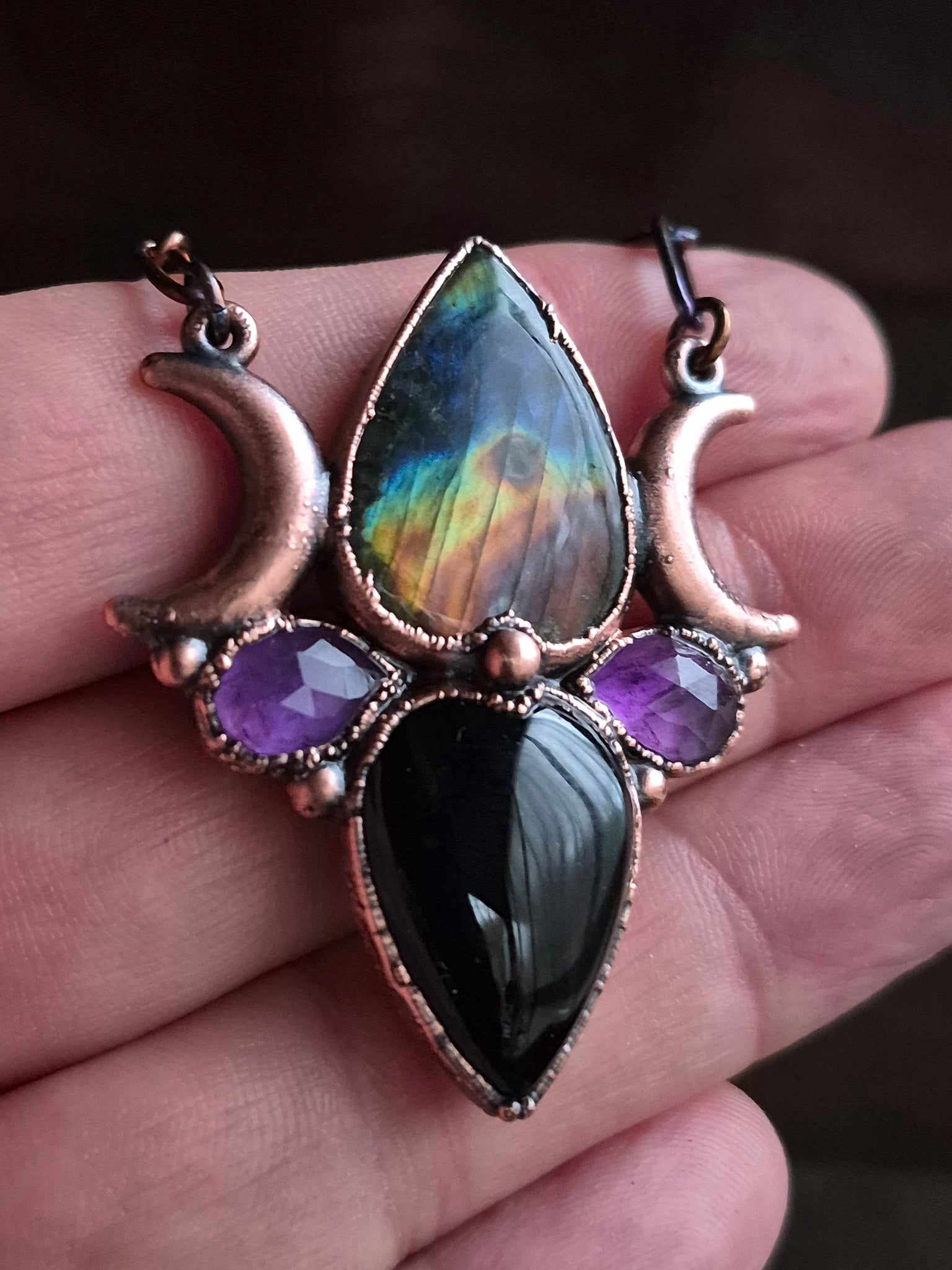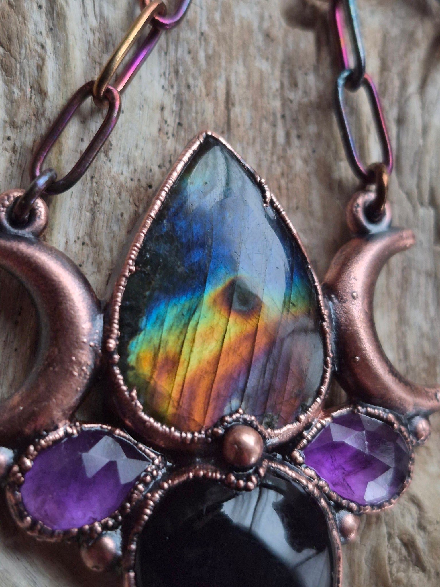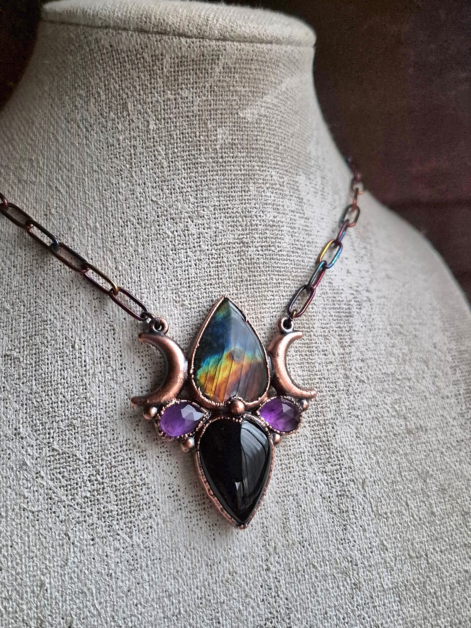 Materiali: Labradorite "Rainbow" di alta qualità, Rame naturale, Onice Nera, Ametista sfaccettata, catenina in acciaio Brunito di 40 centimetri.
