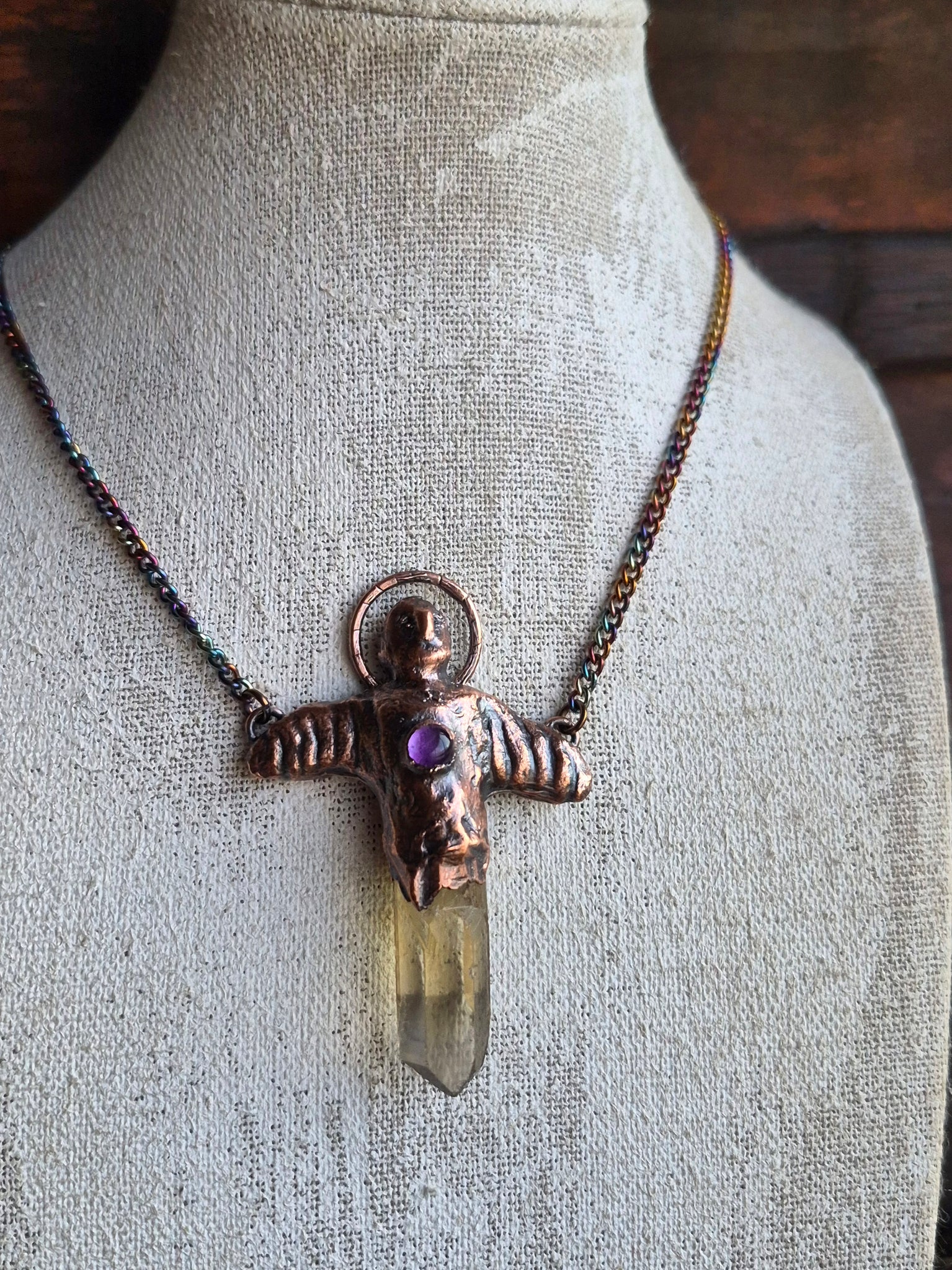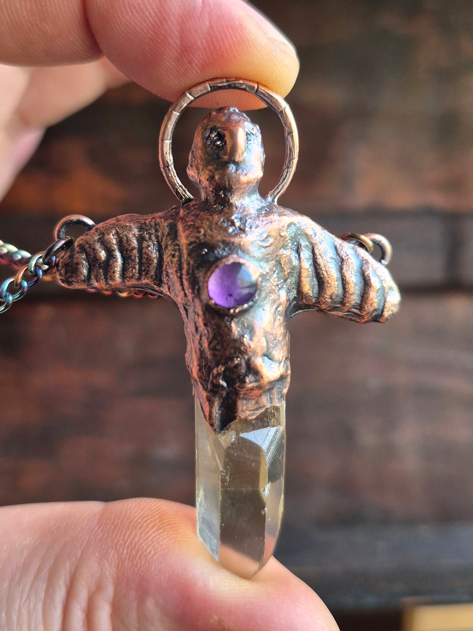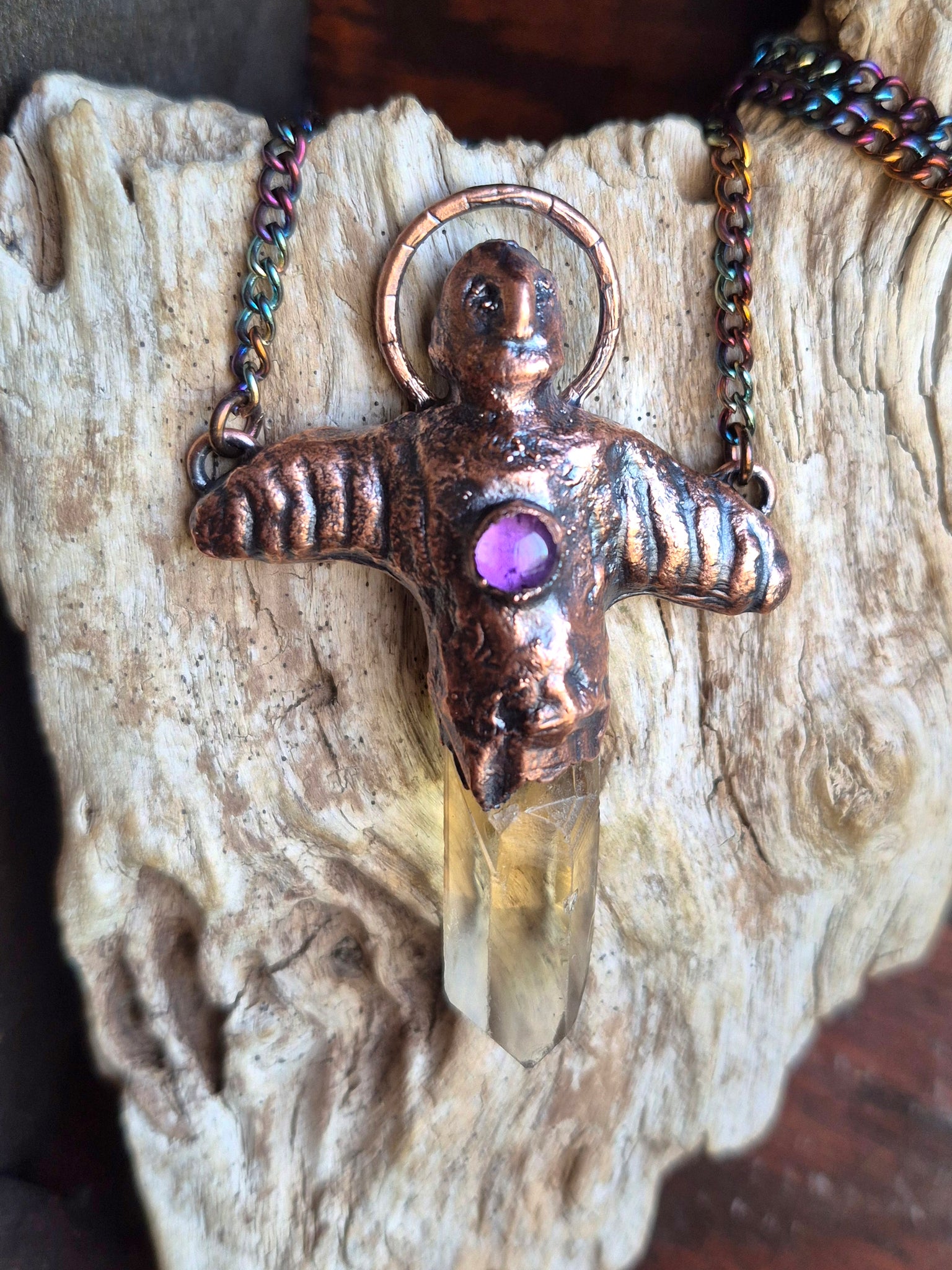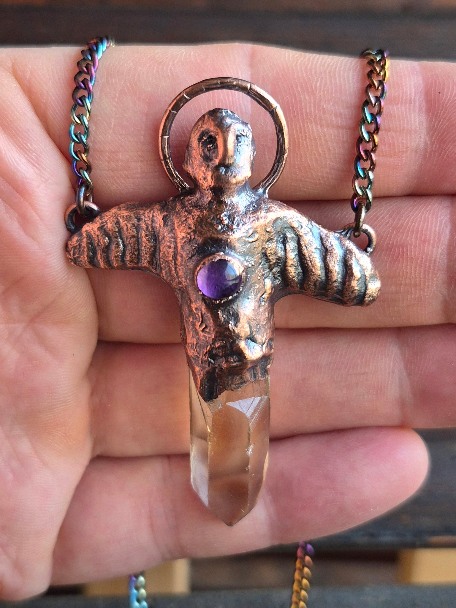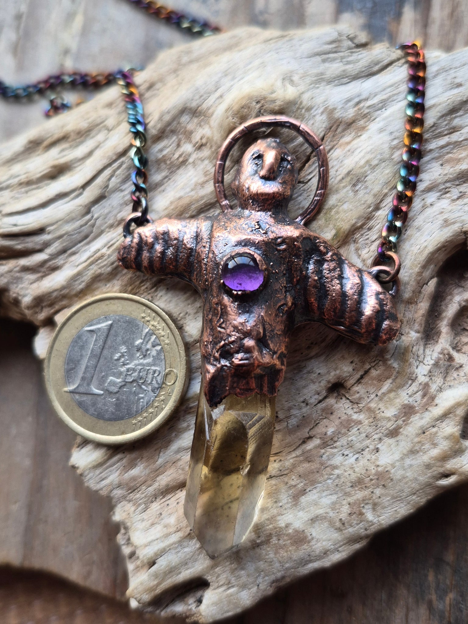 Il gioiello è realizzato in Rame trattato con patina anticante e viene fornito con una catenina in acciaio policromo di 45 centimetri