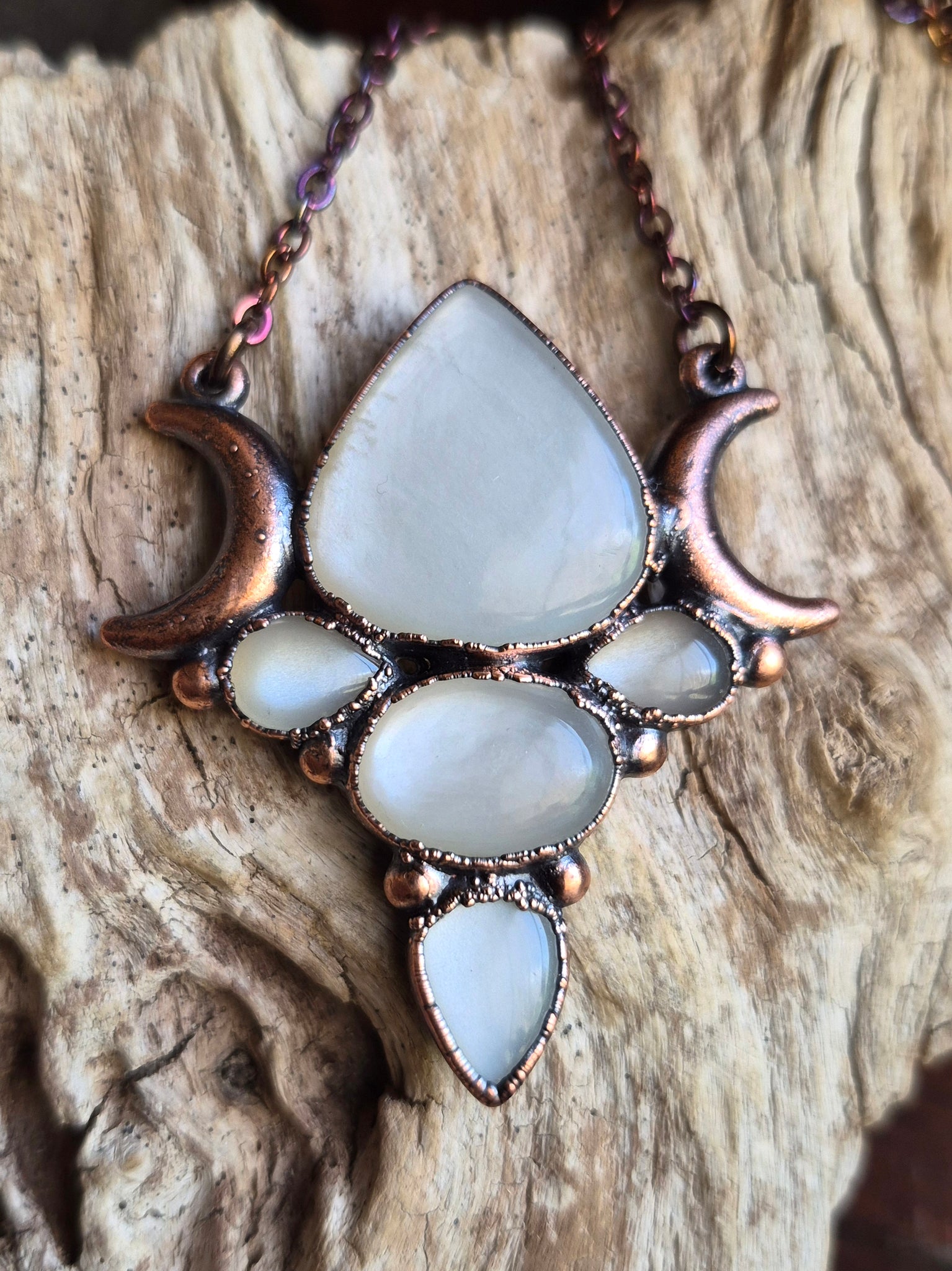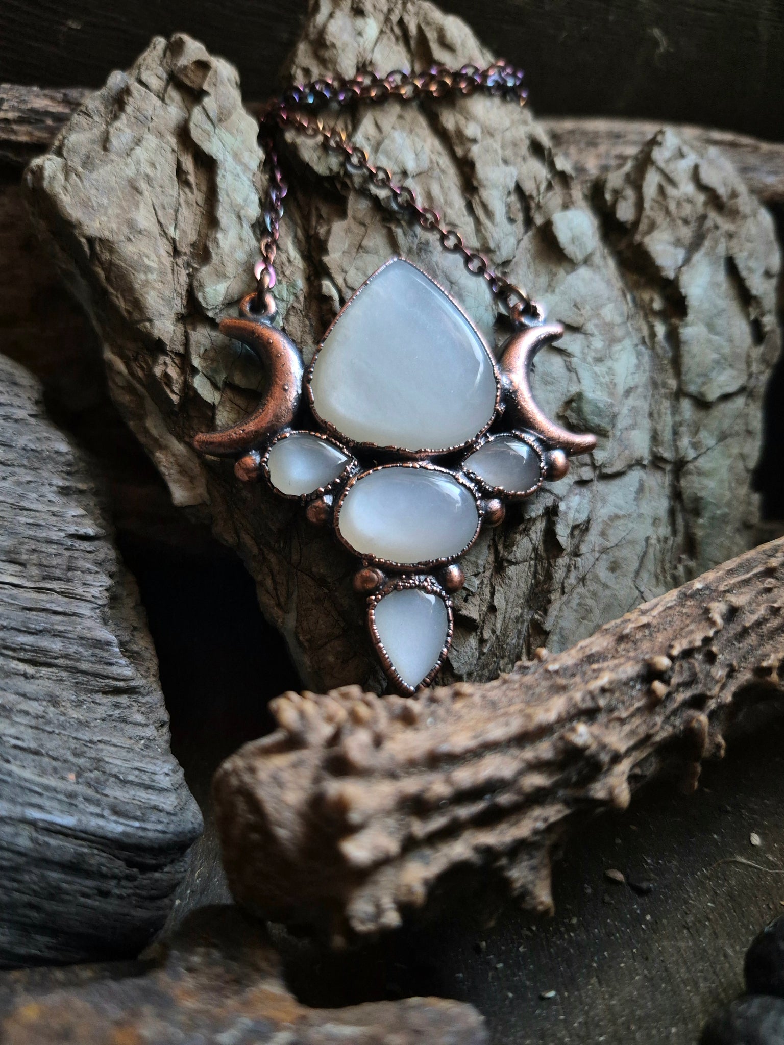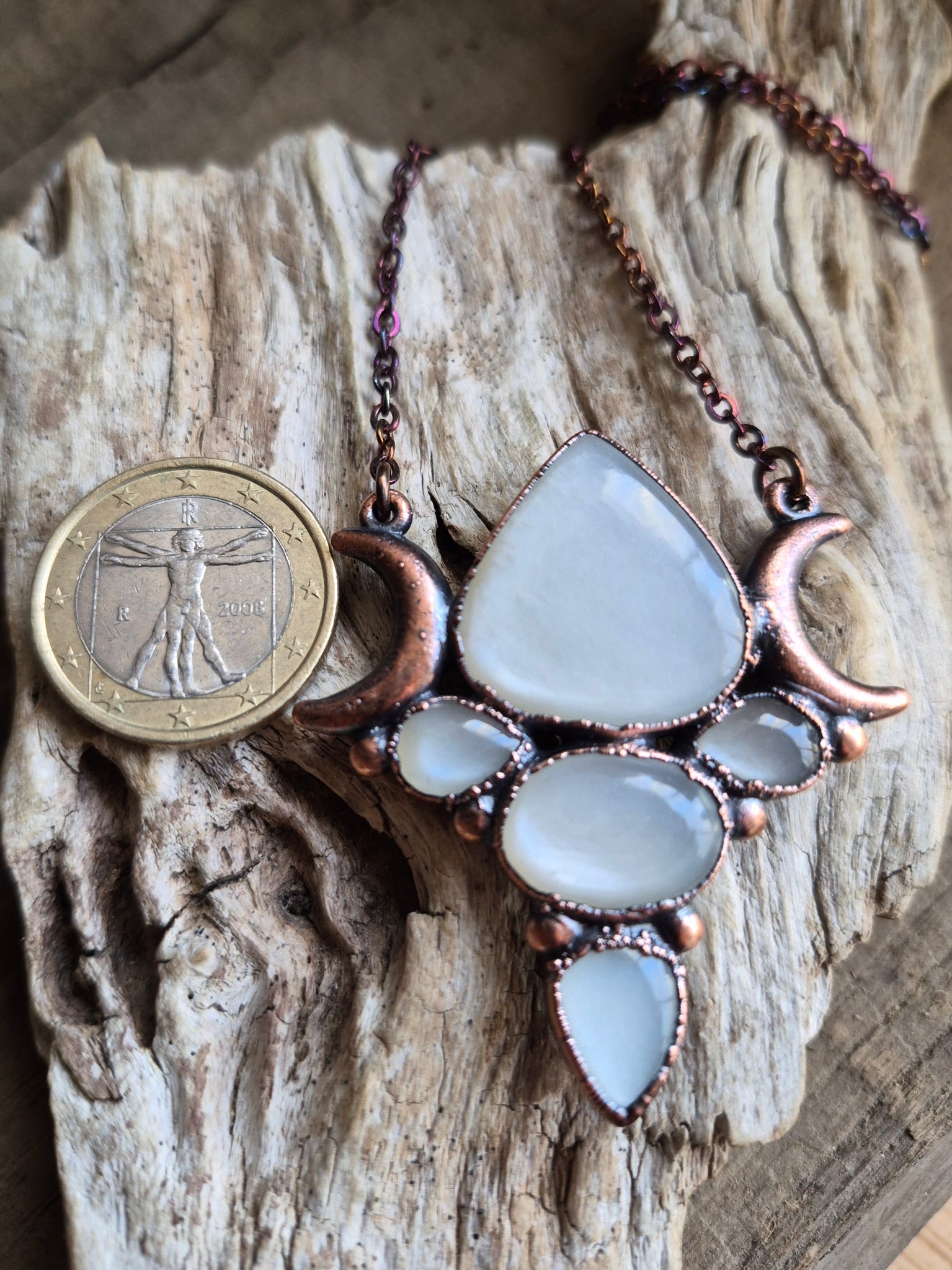 Il gioiello è realizzato in Rame trattato con patina anticante per un aspetto magico e fuori dal tempo, viene fornito con una catenina in acciaio policromo di 43 centimetri
