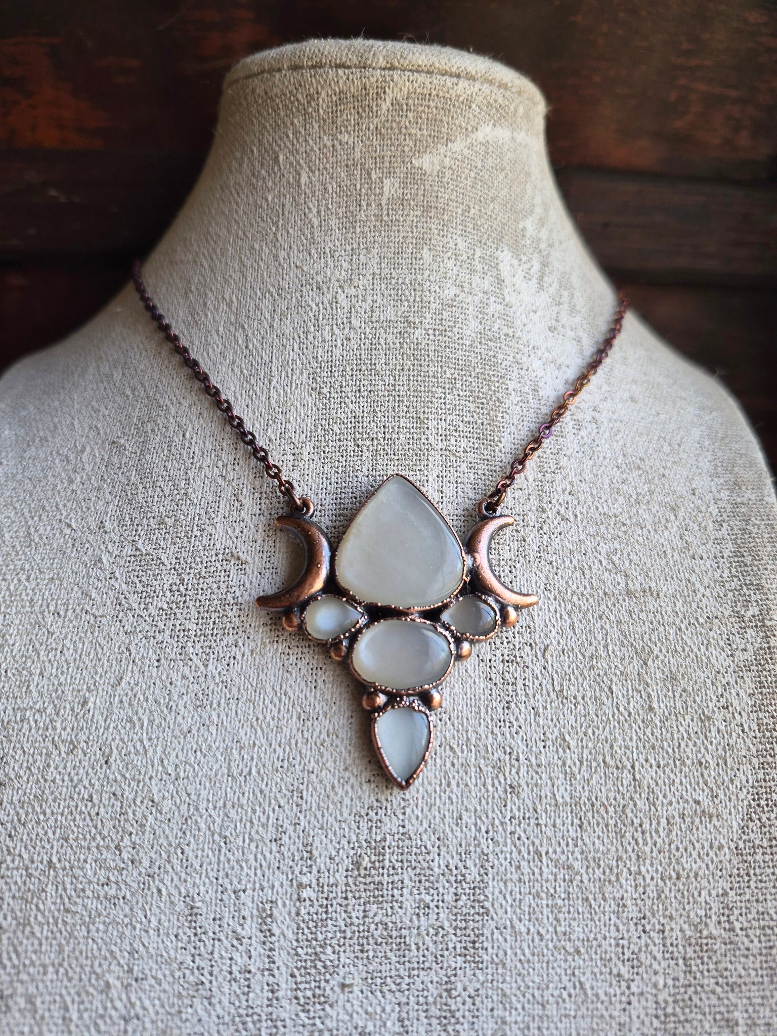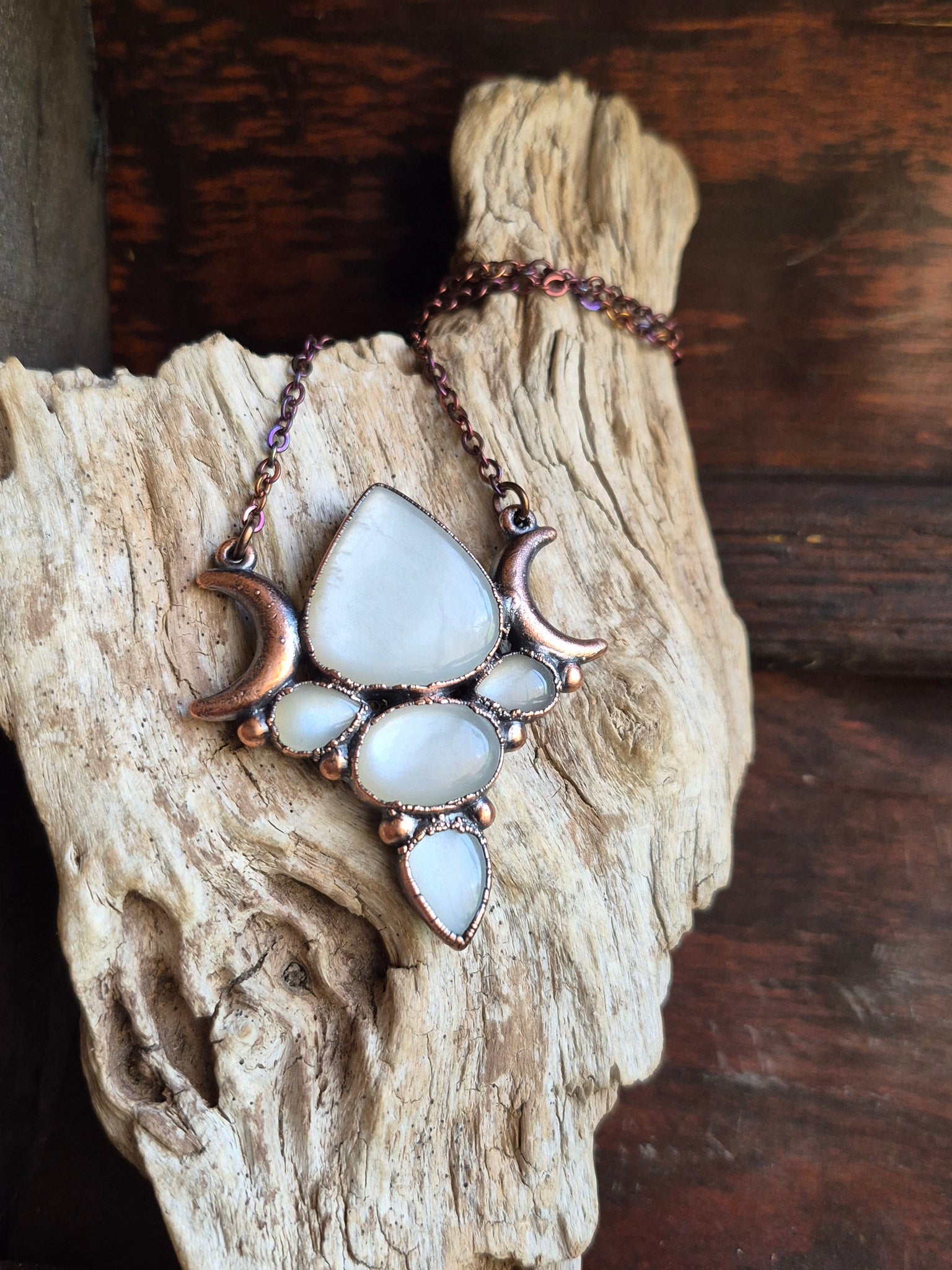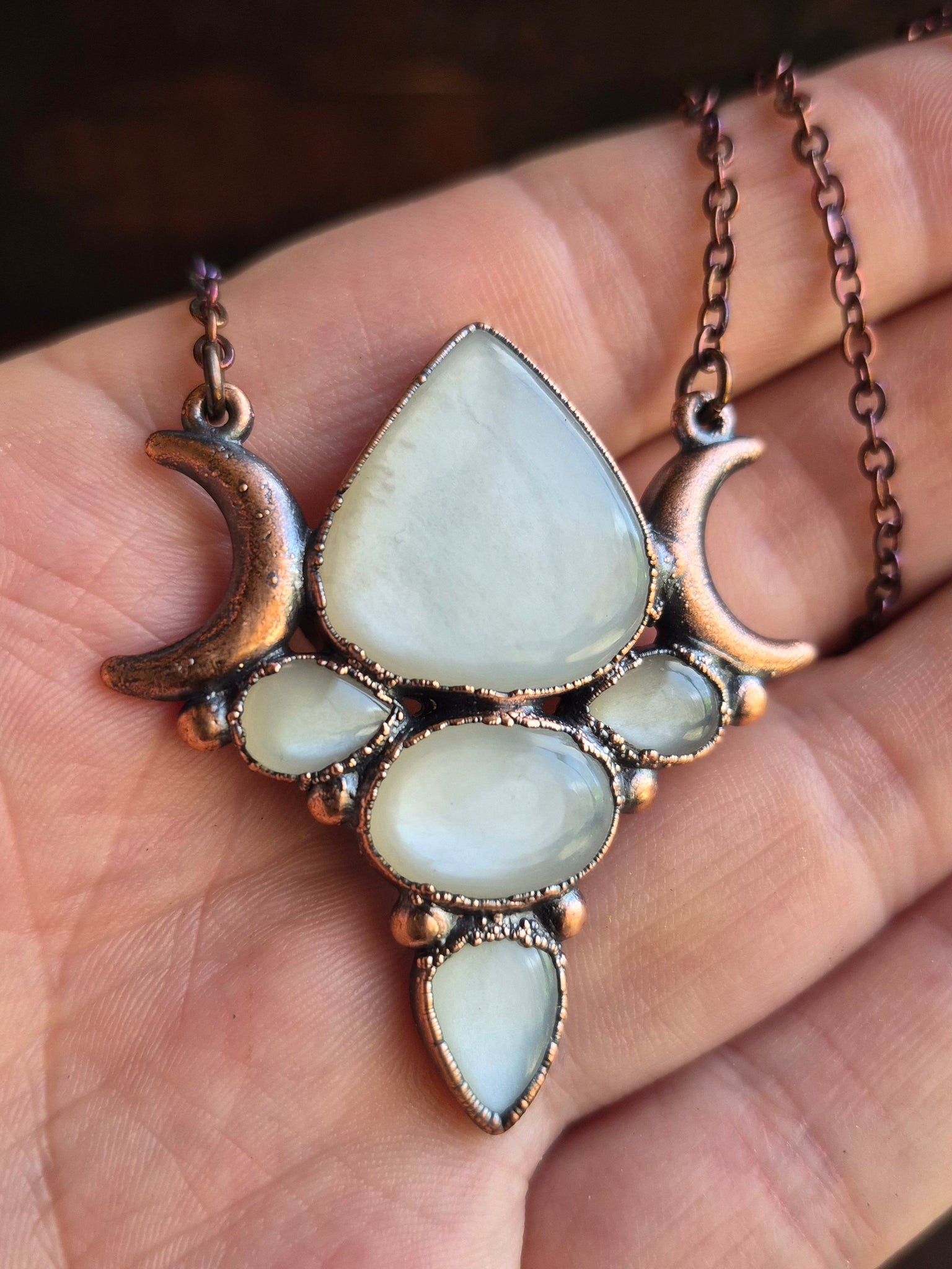 Il gioiello è realizzato in Rame trattato con patina anticante per un aspetto magico e fuori dal tempo, viene fornito con una catenina in acciaio policromo di 43 centimetri